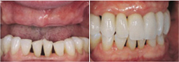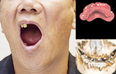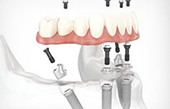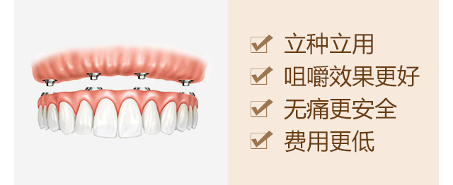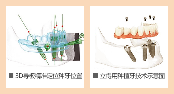 利用4颗种植体,于两颗前牙部位的种植体垂直植入牙槽骨内,而两颗中远部位的种植体采取倾斜角度植入牙槽骨内,然后在种植体的基台上安装拱形连桥牙冠,从而实现半口缺失牙完美修复