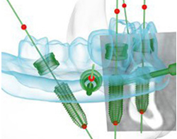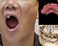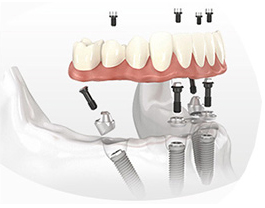 利用4颗种植体,于两颗前牙部位的种植体垂直植入牙槽骨内,而两颗中远部位的种植体采取倾斜角度植入牙槽骨内,然后在种植体的基台上安装“拱形连桥”牙冠,从而实现半口缺失牙完美修复。
